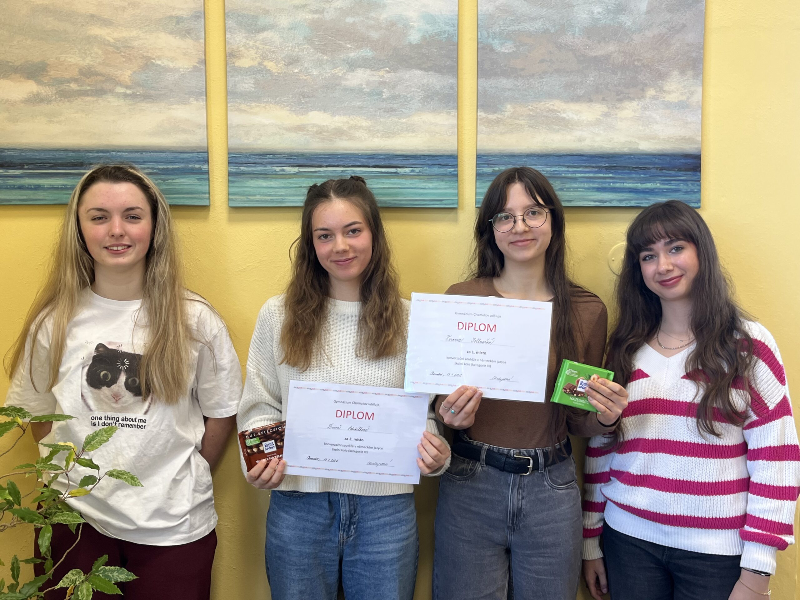 Dne 19.01. 2026 se na naší škole uskutečnila ústní část školního kola konverzační soutěže v německém jazyce kategorie III. 1. místo obsadila Veronika Sollnařová, 2. místo Diana Petržílková a 3. místo Marie Anděla Kučerová. Žáci, kteří se umístili na prvních dvou místech, budou naši školu reprezentovat v okresním kole soutěže dne 19.2.2026. Všem účastníkům děkujeme za účast a vítězům blahopřejeme!