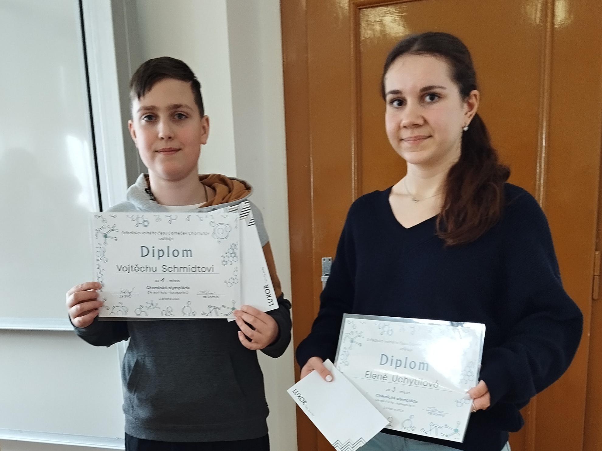 V pondělí 2. 3. 2026 se na naší škole uskutečnilo okresní kolo Chemické olympiády kategorie D. První místo obsadil student 1. F Vojtěch Schmidt a na 3. místě se umístila Elena Uchytilová ze třídy 2. F. Oběma moc blahopřeji a doufám, že nás budou reprezentovat i ve vyšších kategoriích.