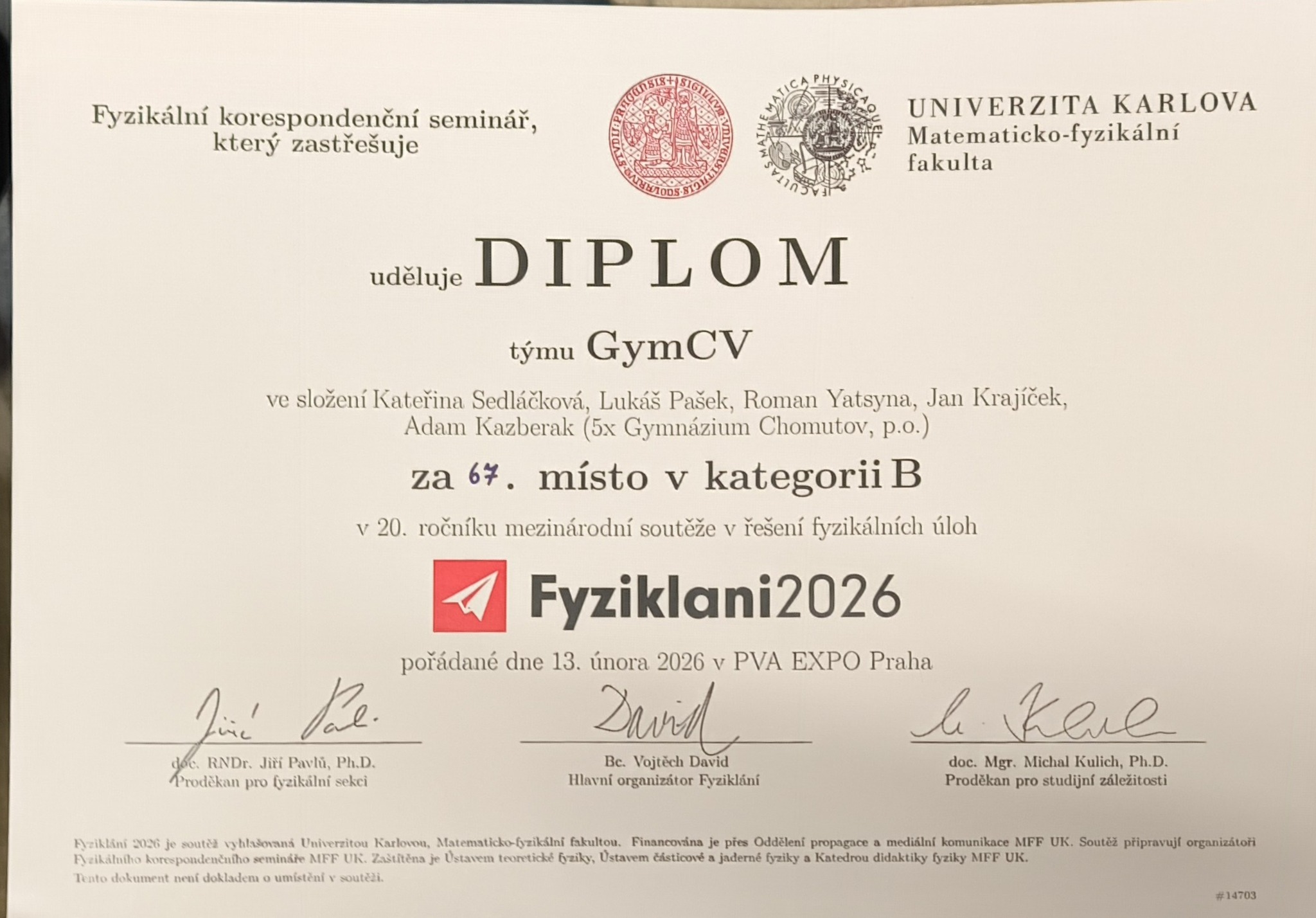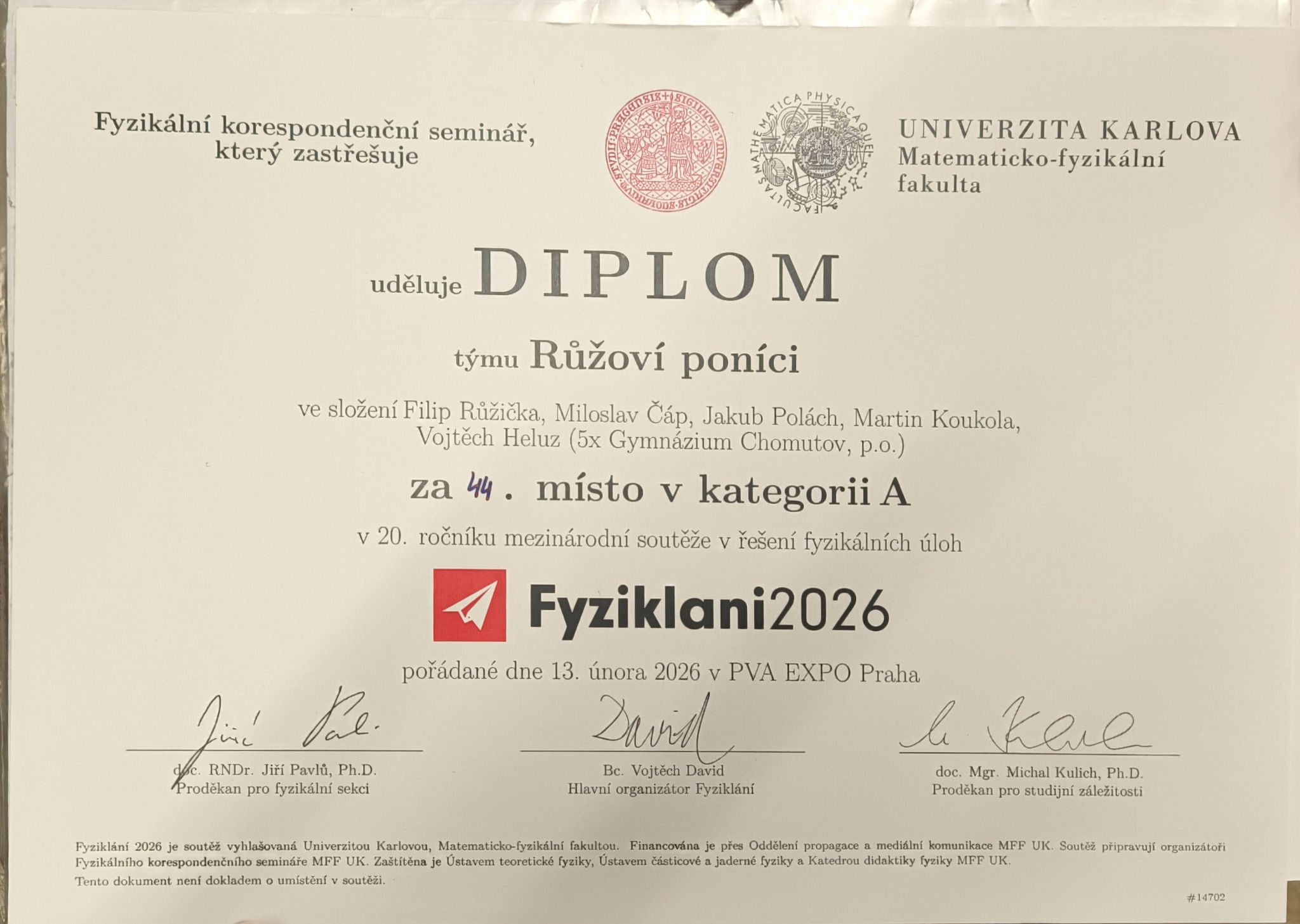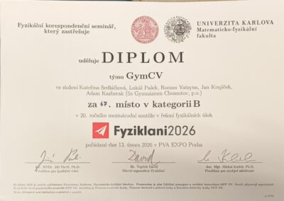 Subjektivní prožitek z výpravy na mezinárodní akci zvanou Fyziklání, pořádanou v Praze roku 2026 již podvacáté v řadě, zachycuje předcházející kousek poezie, jenž může sloužit k vykreslení atmosféry uměleckou cestou. Osobně velmi doporučuji účast na následujících ročnících studentům se zájmem o fyziku i jiným odvážlivcům. Nicméně čistě faktickým výstupem jsou chvályhodné výsledky obou týmů: